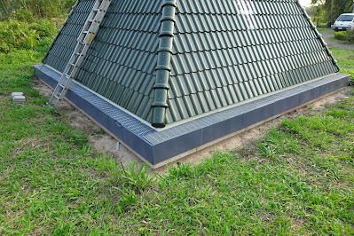 The U-ditches are ready and the draining of rainwater of the roof to the pond works properly. We had a lot more work to do with installing the galvanized racks. Not a single rack was fitting because of a terrible quality of the concrete u-ditches. With a grinder and cement we had to made it fit and this all took a lot of time. Two layers of Supershield on the inside and outside and to be honest, still not as nice as the fist guest pyramid but it is the way it is. We also installed the planks under the lowest row of rooftiles.